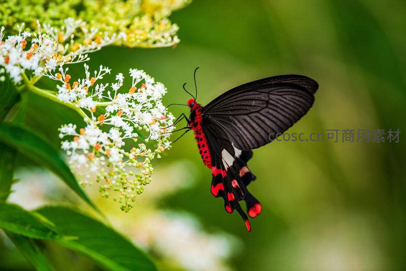 一只拥有黑色翅膀和鲜红色斑纹的凤蝶正专注地从一簇洁白的小花中吸取花蜜,其尾部的红色流苏状结构尤为醒目,展现了自然界中惊人的色彩搭配。