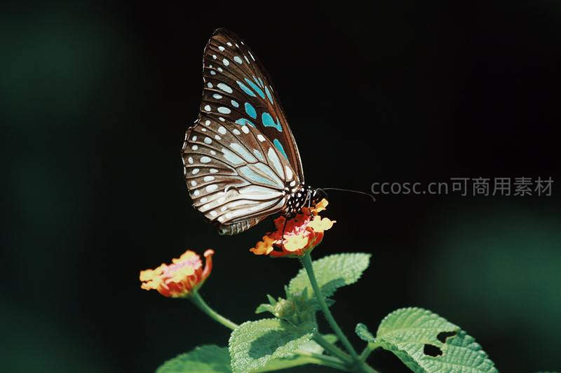 一只蓝斑蝶优雅地停驻在橙黄色的小花上,翅膀上的蓝色斑点与深褐色底纹相映成趣,背景虚化突出主体,展现自然生态的细腻之美。