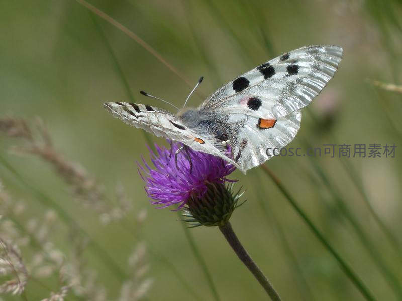 一只洁白带黑斑的蝴蝶停驻在紫色蓟花上,翅膀舒展,背景是柔和的绿色草地,展现自然生态的宁静与美好。