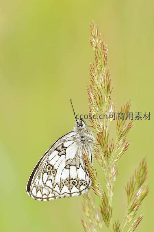 一只洁白的蝴蝶停驻在青翠草尖上,翅膀纹理清晰可见,背景虚化突出主体,展现大自然中微观世界的宁静与精致。
