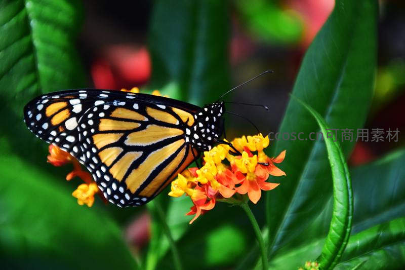 经典的帝王蝶停在橙黄色小花丛中,翅膀上的橙黑纹路清晰可见,周围绿叶衬托其优雅身姿。