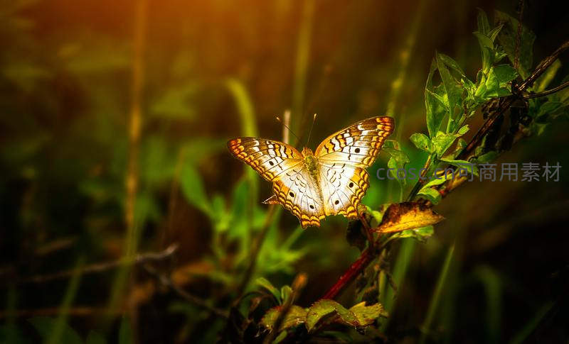 温暖的夕阳光线穿透草丛,照亮了一只停在枝叶上的金色蝴蝶,其翅膀纹理清晰可见,营造出宁静而梦幻的自然氛围。