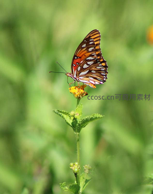 一只翅膀带有橙色和白色花纹的蝴蝶,静静停在细长茎秆顶端的黄色小花上,背景虚化,突出主体,尽显自然之美。