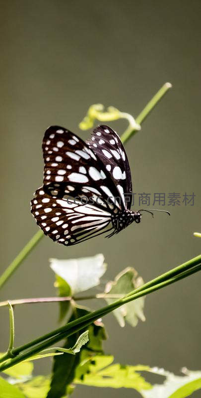 一只黑白相间的斑点蝴蝶优雅地停在细长的绿色枝条上,背景虚化突出主体,展现其精致的翅膀纹理与自然环境的和谐共生。