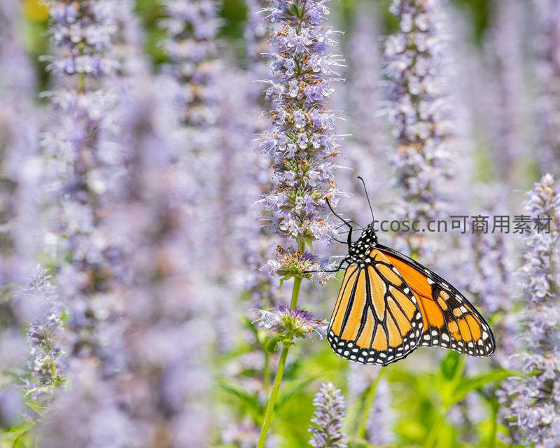 鲜艳的帝王蝶停落在淡紫色花簇上,橙黑相间的翅膀在阳光下熠熠生辉,周围花海朦胧,营造出温暖而生动的自然生态画面。