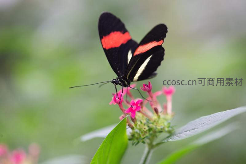 一只翅膀以黑色为底、饰有鲜艳红色横带的蝴蝶,正用口器轻触一簇粉红色小花,色彩对比强烈,画面充满生机与活力。