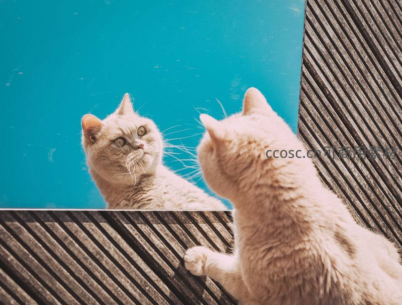 一只浅奶油色猫咪正对着蓝色镜面,好奇地观察自己的倒影,木质地板与镜中影像构成有趣的视觉对话。