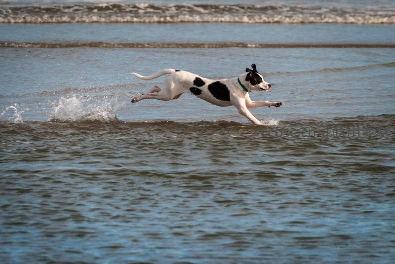 一只黑白斑点的狗在海边浅水区全力奔跑,四脚离地,溅起晶莹水花,背景是层层海浪,充满活力与自由的气息。