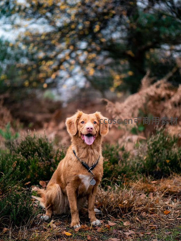 一只棕色长毛犬坐在秋日林间,背景是金黄与翠绿交织的灌木丛,它张着嘴露出舌头,眼神明亮,充满活力与快乐。