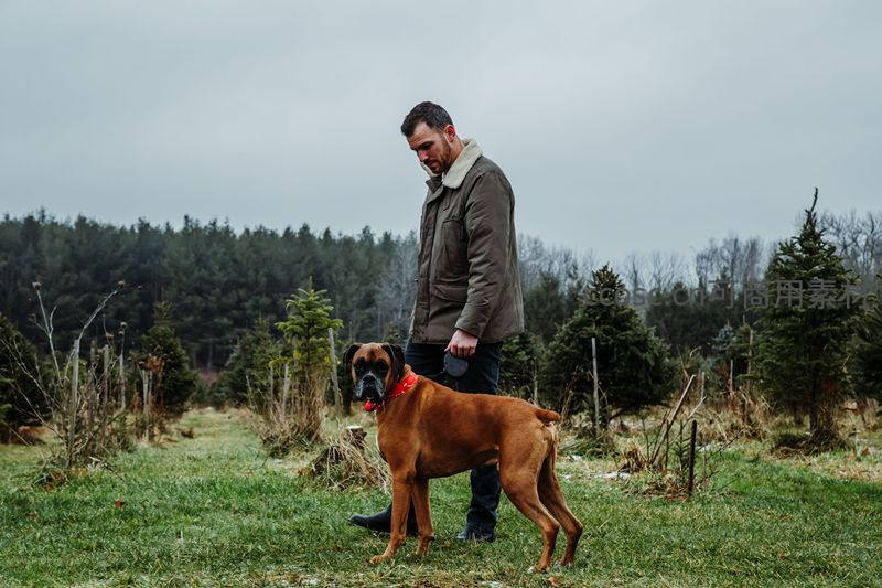 一名男子牵着一只戴着红色项圈的拳师犬,在一片种满圣诞树的田野中散步,天空阴沉,环境宁静,展现出人与宠物的温馨时刻。