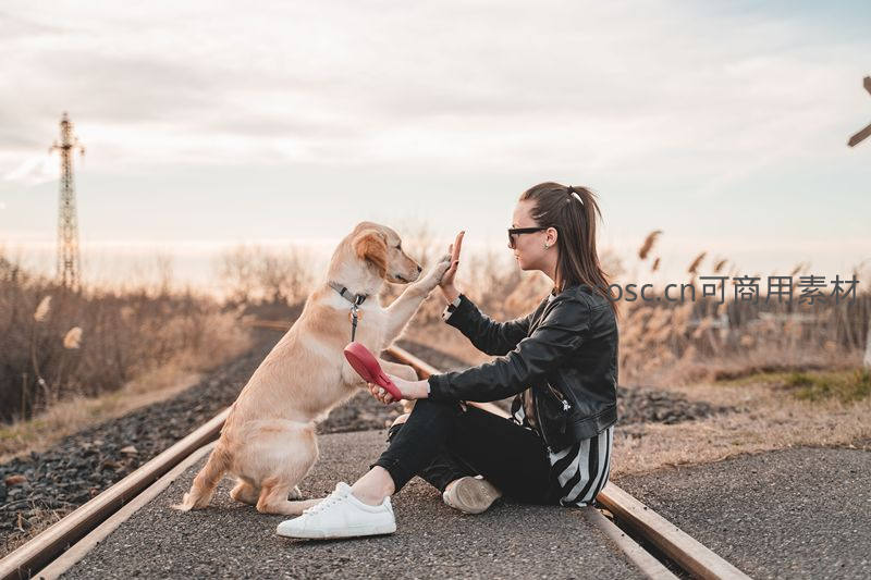 黄昏时分,一位女孩坐在铁轨上与金毛犬击掌,背景是枯草与晚霞,展现人与宠物间充满信任与乐趣的时刻。