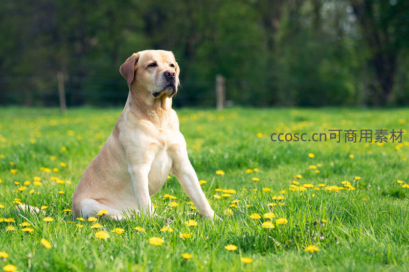 一只黄色拉布拉多犬安静地坐在开满蒲公英的翠绿草地上,背景是模糊的树林,营造出宁静惬意的田园氛围。