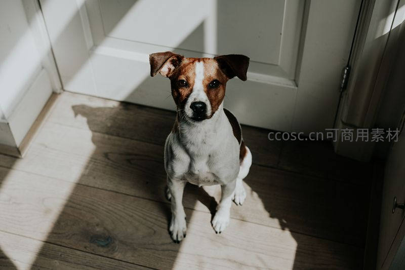 一只棕白杰克罗素犬坐在木质地板上,阳光透过门缝投下几何光影,它抬头凝视镜头,神情专注而温顺。