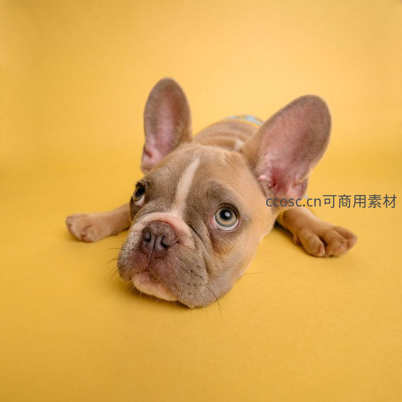 一只浅棕色法国斗牛犬幼犬趴在明亮的黄色背景上,大眼睛无辜地向上看,表情呆萌,耳朵竖立,充满治愈力。
