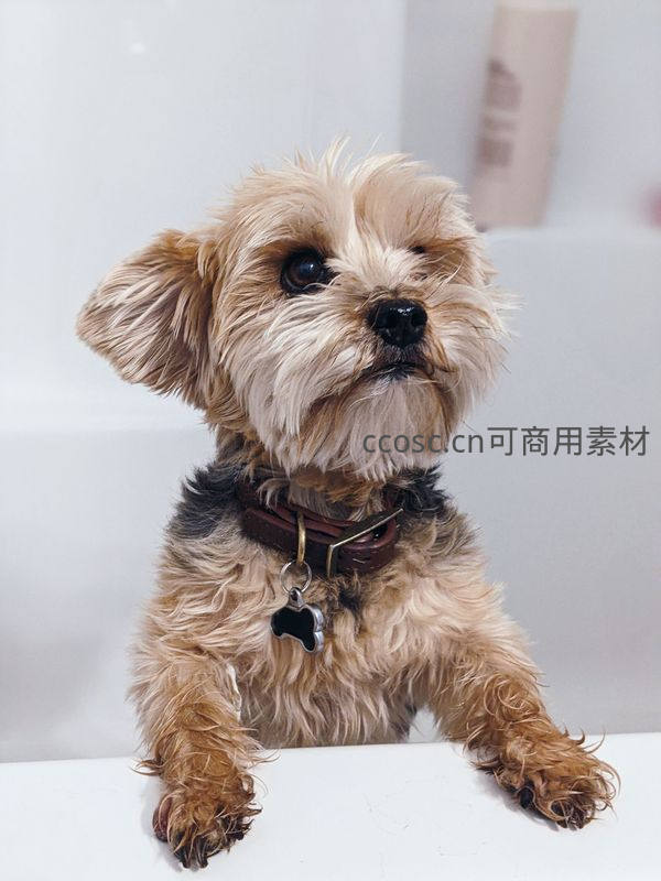 刚洗完澡的小狗湿漉漉地趴在浴缸边,毛发贴在脸上,眼神无辜又好奇地向上张望,尽显天真无邪的萌态,令人忍不住想抱抱它。