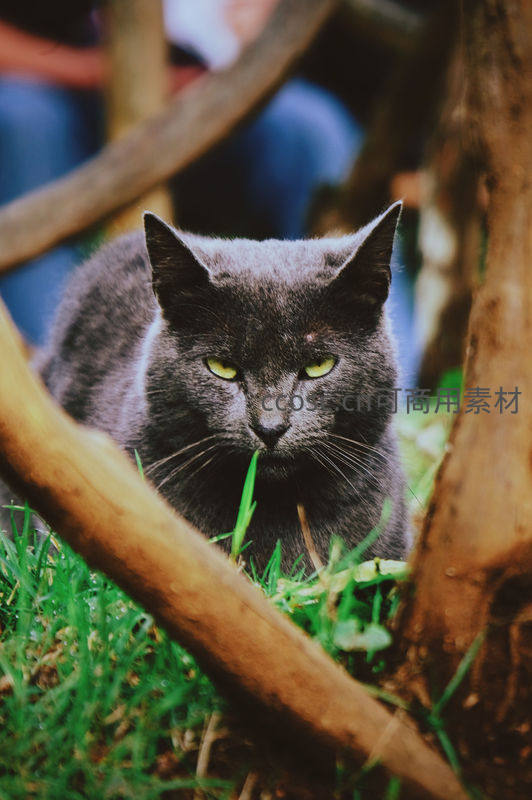 一只灰色短毛猫藏身于绿草与枯枝之间,明亮的黄绿色眼睛直视镜头,营造出一种静谧而略带神秘的自然氛围。