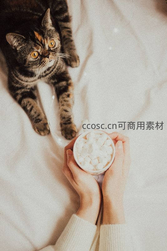 一只虎斑猫慵懒地趴在柔软的白色床单上,一双明亮的眼睛注视着镜头。前景中,一双温暖的手捧着一杯缀满棉花糖的热饮,营造出宁静而治愈的居家氛围。