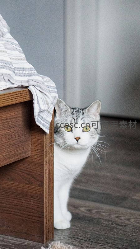 一只银白相间的猫咪从木质床脚后方悄悄探出脑袋,一双圆溜溜的绿眼睛充满好奇地打量着世界。它洁白的爪子和条纹床单构成一幅温馨可爱的居家场景。