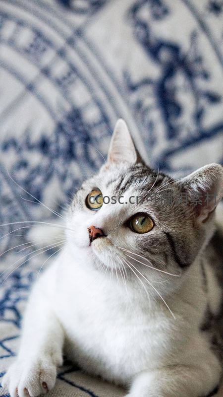 银白猫咪凝视远方,蓝白花纹背景衬托优雅