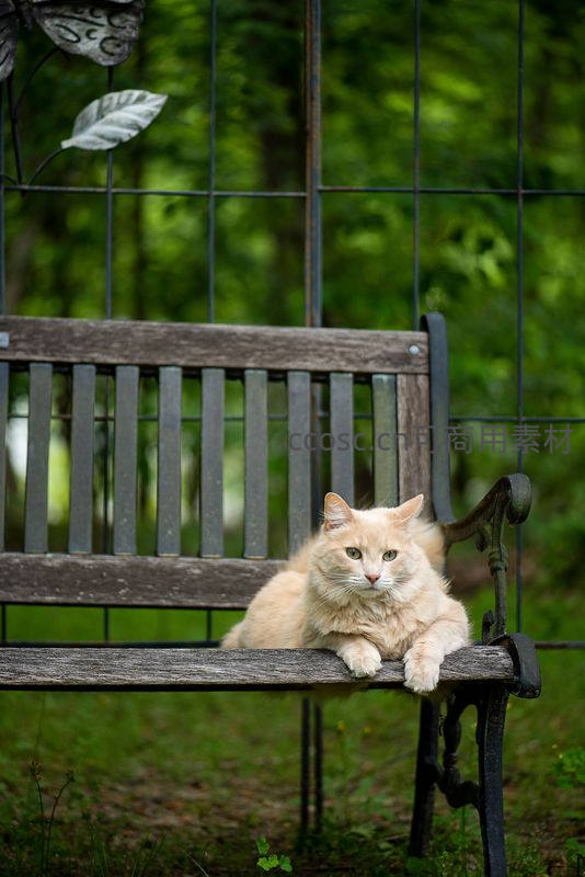 一只蓬松的橘猫慵懒地趴在公园木制长椅上,阳光透过树叶洒下斑驳光影,四周绿意盎然,宁静怡人。