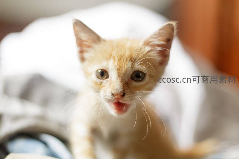 一只毛茸茸的橘色小奶猫正对着镜头张开小嘴,似乎在打哈欠或发出细弱叫声,无辜的大眼睛和柔软的绒毛让人忍不住想抱抱它。