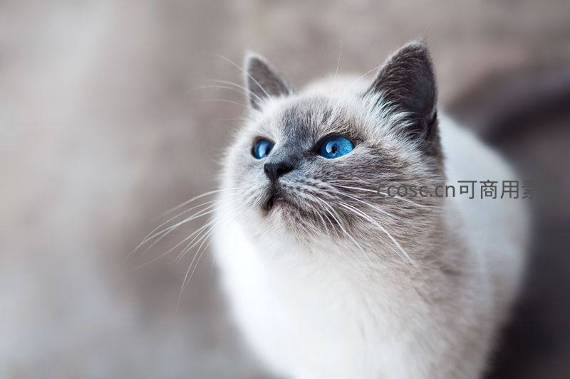 一只拥有深邃蓝色眼眸的暹罗猫,正抬头凝视着远方,神情专注而宁静,柔软的毛发在光线下泛着柔和光泽。