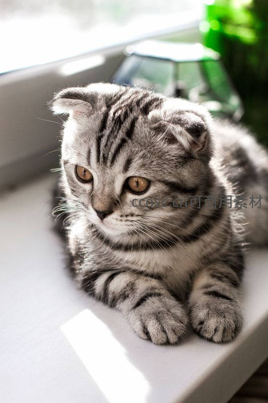 一只银色条纹的苏格兰折耳猫蜷缩在洒满阳光的窗台上,耳朵自然下垂,眼神温柔,享受着午后的宁静与温暖。