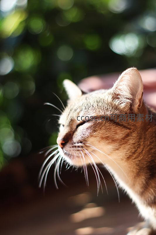 阳光洒落虎斑猫侧颜微闭双眼