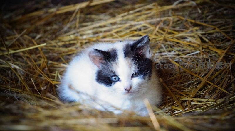 黑白小奶猫蜷缩干草堆中