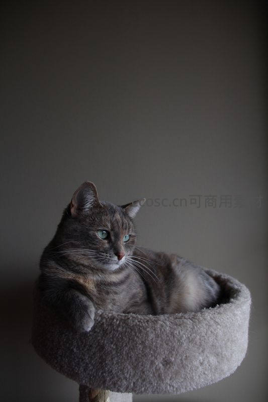 一只灰色虎斑猫慵懒地卧在猫爬架顶端的绒毛窝里,碧绿色的眼睛专注凝视前方,背景简洁,凸显其高贵气质。