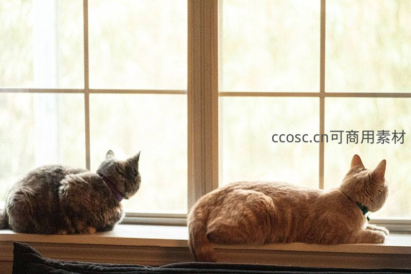 两只猫咪一左一右安静地趴在窗台上,沐浴着柔和的日光,背对镜头眺望窗外,画面充满宁静与治愈感。
