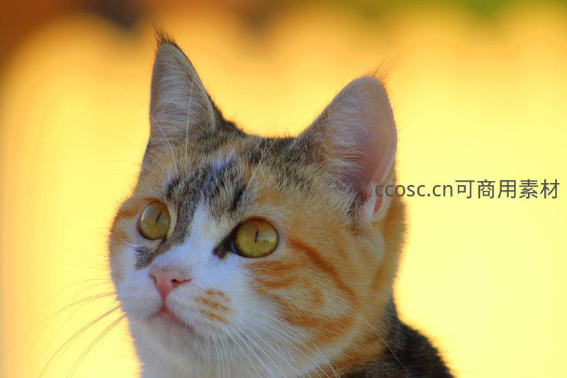 一只橘白相间的猫咪侧脸沐浴在金色暖阳下,明亮的黄绿色眼睛望向远方,画面温暖宁静,充满诗意与生机。