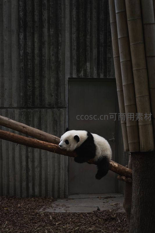 一只憨态可掬的熊猫幼崽趴在木枝上,黑白分明的毛色与木质背景形成对比,尽显可爱与自然栖息的惬意时光。
