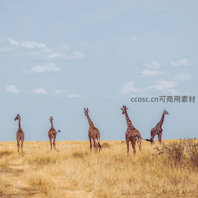 五只长颈鹿整齐排列在无垠的草原上,昂首望向远方的蓝天白云,修长的脖颈与金黄草浪构成和谐画面,充满诗意与生机。