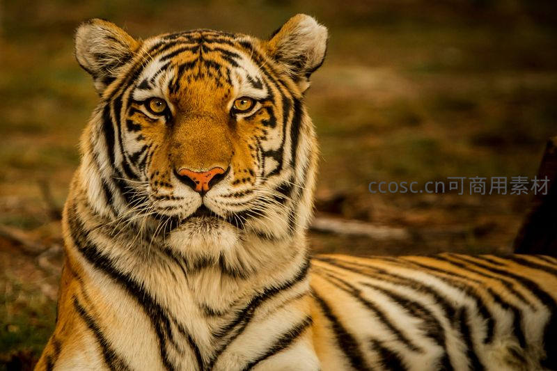 一只老虎在幽暗丛林中直视镜头,琥珀色双眼炯炯有神,橙黑条纹清晰可见,浓密胡须与肌肉线条尽显野性魅力,令人屏息。