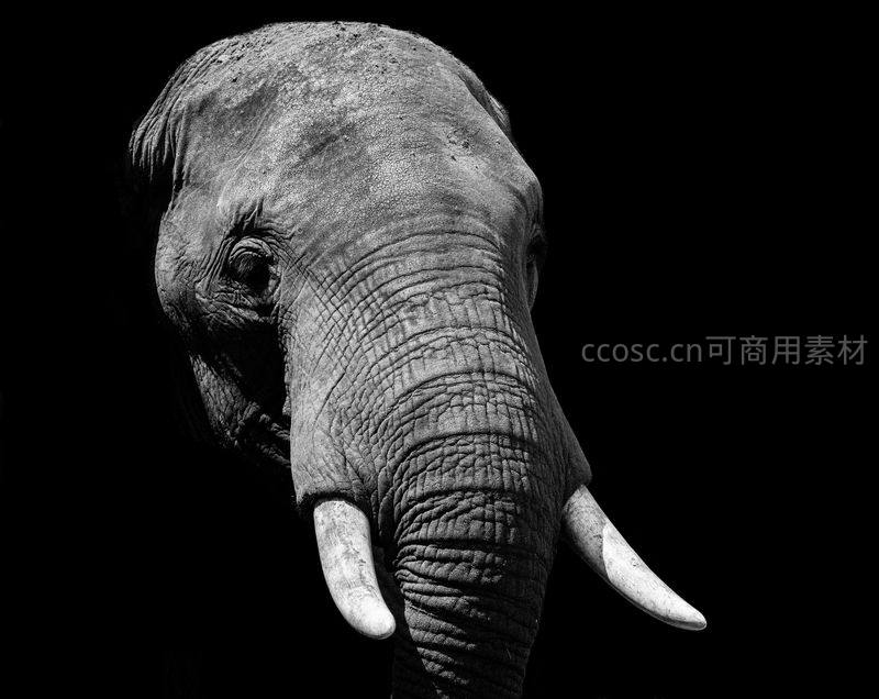 以高对比度黑白风格呈现的大象头部特写,突显其皮肤褶皱与象牙的质感,传递出庄重与岁月沉淀的力量感。