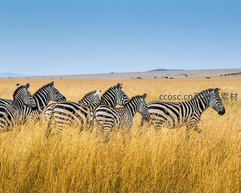 斑马群漫步金黄草原蓝天之下