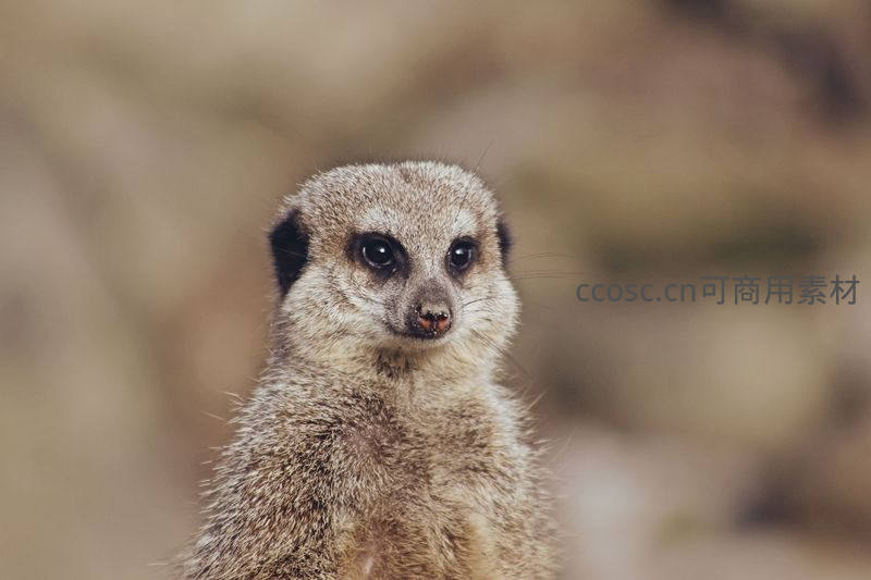 一只狐獴正对着镜头,眼神专注而警觉,细腻的毛发和深邃的眼睛在柔和光线下清晰可见,充满灵性与萌态。