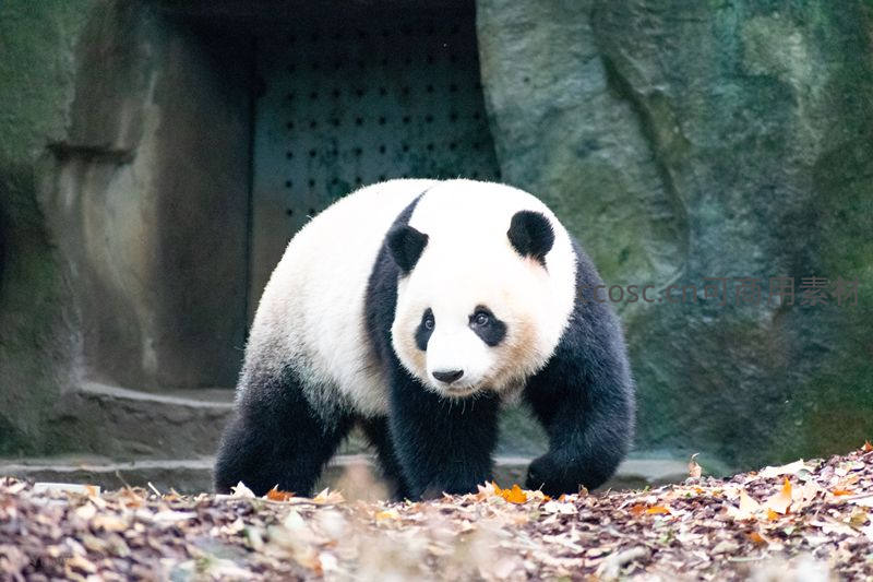 一只圆滚滚的大熊猫迈着稳健的步伐走过铺满落叶的地面,黑白分明的毛色与岩石背景相映成趣,尽显其呆萌可爱。