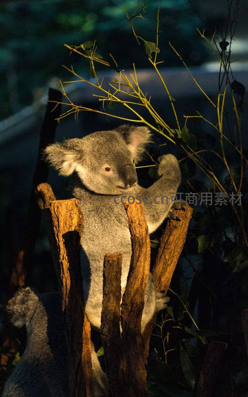 一只灰褐色的考拉在黄昏时分攀附于木桩之上,阳光斜照勾勒出其蓬松轮廓,背景枝叶朦胧,尽显自然生灵的静谧与安逸。