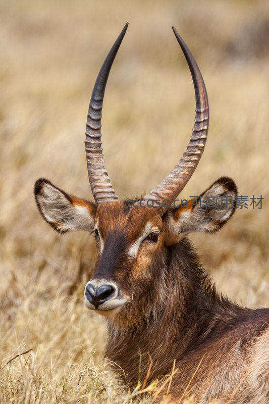 一只水羚安详卧于金黄草原之上,修长弯曲的双角格外醒目,它转头回望镜头,眼神温顺而警觉,尽显自然生灵之美。