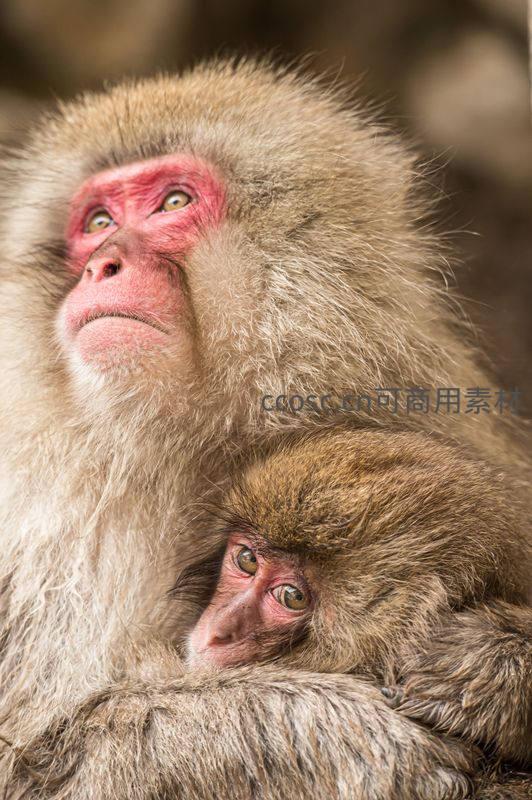 镜头捕捉到一对日本猕猴母子依偎的瞬间,母亲眼神温柔而警觉,幼崽则安然蜷缩在怀中,浓密的毛发和鲜红的脸颊在柔和光线下显得格外生动。