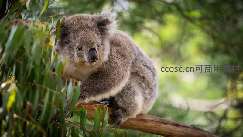 一只憨态可掬的考拉安静地趴在桉树树枝上,灰褐色的绒毛在阳光下显得格外柔软,周围绿叶环绕,充满自然野趣。