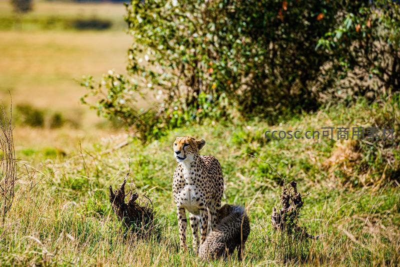 阳光洒落在草原灌木间,一只成年猎豹带着幼崽站立于草丛中,目光锐利地扫视四周,展现出野生猫科动物的优雅与警惕。