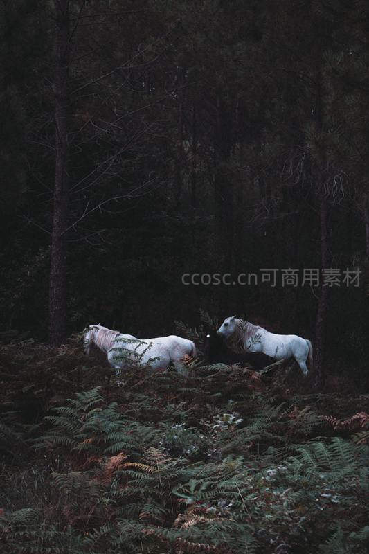 在暮色笼罩的深林里,两匹洁白如雪的骏马缓步穿行于茂密蕨丛之间,营造出一种梦幻、宁静且略带神秘的童话氛围。