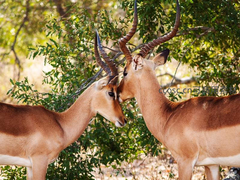 在绿意盎然的树荫下,两只雄性黑斑羚用螺旋状长角温柔相抵,既是力量的较量,也是情感的交流,展现动物世界的细腻一面。
