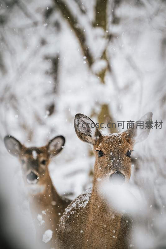 两只小鹿伫立在飘雪的林间,雪花轻柔地落在它们的皮毛和耳朵上,它们安静地凝视前方,营造出一种宁静而诗意的冬日氛围。