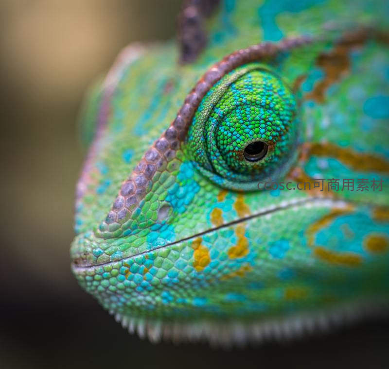 变色龙头部侧面特写,眼睛结构复杂而精致,绿色鳞片纹理清晰可见,色彩层次丰富,展现出生物微观世界的奇妙与细腻。