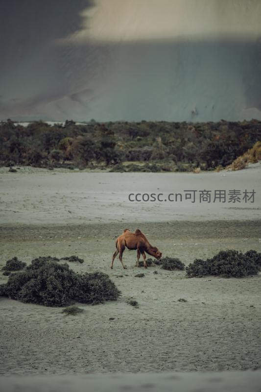 一只单峰骆驼在阴沉天空下的广阔沙地上独自觅食,稀疏的灌木点缀其间,展现出生命在严酷环境中的坚韧与孤寂。