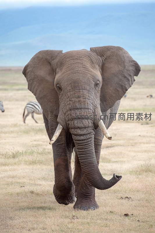 一头雄壮的非洲象正朝镜头走来,宽大耳朵扇动,卷曲长鼻轻摆,背景是辽阔的稀树草原和悠闲的斑马,展现野性大陆的恢弘生机。